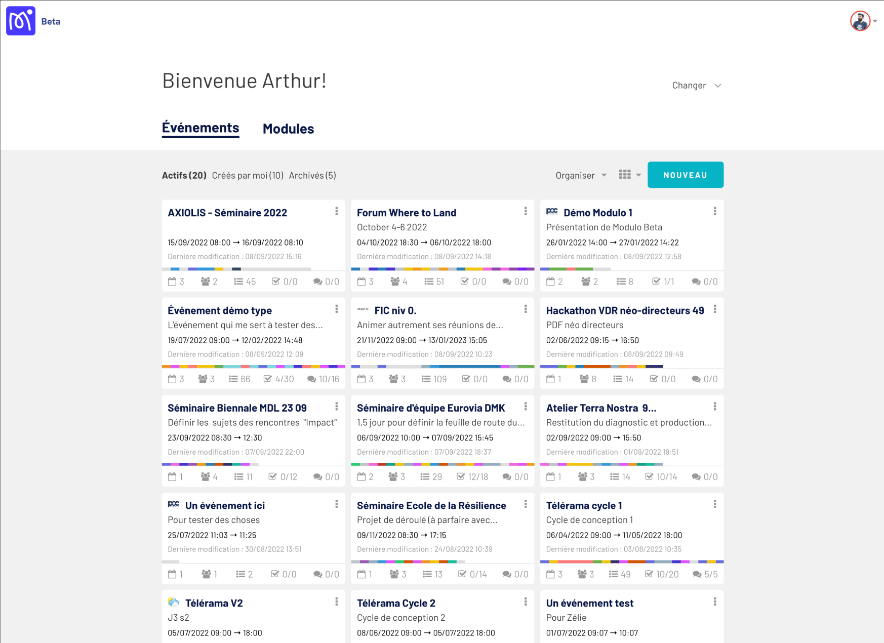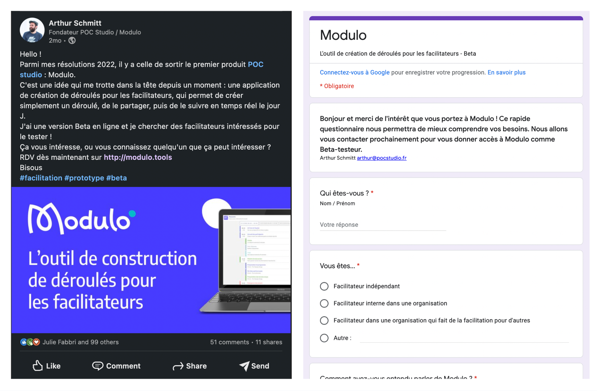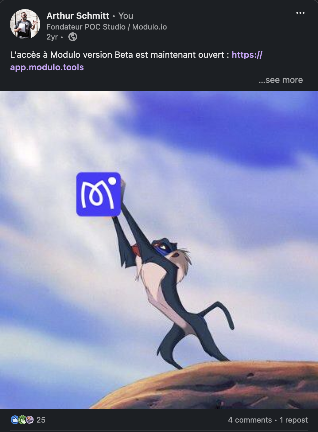 La première version fonctionnelle de Modulo a été développée en quelques semaines en début 2022. Dès qu'une version à peu près fonctionnelle était en ligne, Arthur a fait un post Linkedin pour mesurer l'intérêt et réunir des premiers utilisateurs intéressés.